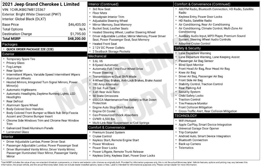 Standard Equipments on 2021 Jeep Grand Cherokee L Limited 4x4 in Waterbury, CT