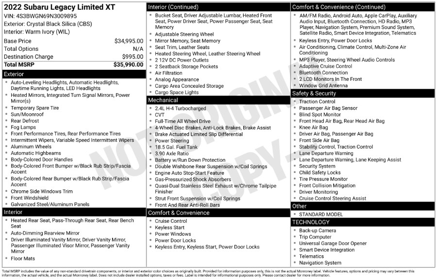 Standard Equipments on 2022 Subaru Legacy Limited XT CVT in Waterbury, CT